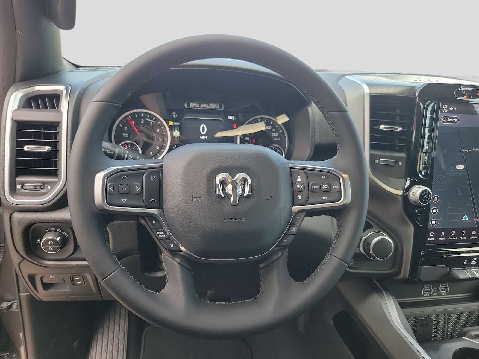 BIG HORN LEVEL 2 EQUIPMENT GROUP SiriusXM Radio Service, Power Adjustable Pedals, Leather Wrapped Steering Wheel, 12 Touchscreen Display, Glove Box Lamp, Auto Power-Folding Mirrors, 115V Auxiliary Rear Power Outlet, Media Hub w/2 Charge Only USBs, Heated Front Seats, Security Alarm, Black Premium Power Mirrors, Premium Overhead Console, 9 Amplified Speakers w/Subwoofer, Disassociated Touchscreen Display, Secondary Active Grille Shutters, Wireless Charging Pad, Body Color Fender Flares, Remote Tailgate Release, 115V Auxiliary Power Outlet, LED Dome Lamp w/On/Off Switch, Universal Garage Door Opener, 2nd Row In Floor Storage Bins, Sun Visors w/Illuminated Vanity Mirrors, LED Footwell Lighting, Rear Window Defroster, Rear View Auto Dim Mirror, Rear Power Sliding Window, GPS Navigation, ENGINE: 3.0L I6 HURRICANE SO TWIN TURBO ESS Aux Battery, 700 Amp Maintenance Free Battery, Active Noise Control System, GVWR: 7,100 lbs, 3.55 Rear Axle Ratio, Dual Rear Exhaust w/Bright Tips, Start-Stop Dual Battery System, 230 Amp Alternator, NIGHT EDITION Tires: 275/55R20 OWL All Season, Bridgestone Brand Tires, Accent Color Premium Power Mirrors, Exterior Mirrors w/Supplemental Signals, Black Headlamp Bezels, Exterior Mirrors Courtesy Lamps, Grille Black Surround Black Mesh, Auto Power-Folding Mirrors, Wheels: 20 x 9.0 Aluminum Painted Clad, Auto Dim Exterior Driver Mirror, Black Exterior Truck Badging, Anti-Spin Differential Rear Axle, Accent Color Door Handles, Accent Color Tailgate Handle, Black Interior Accents, Dual Exhaust w/Black Tips, Body Color Front Bumper, Body Color Rear Bumper w/Step Pads, Black Tail Lamp Bezels, RAM Grille Badge - Black, Black Painted Exterior Mirrors Caps, TRANSMISSION: 8-SPEED AUTOMATIC (8HP75). Ram Big Horn with Granite Crystal Metallic Clearcoat exterior and Black interior features a Straight 6 Cylinder Engine with 305 HP at 6400 RPM*.