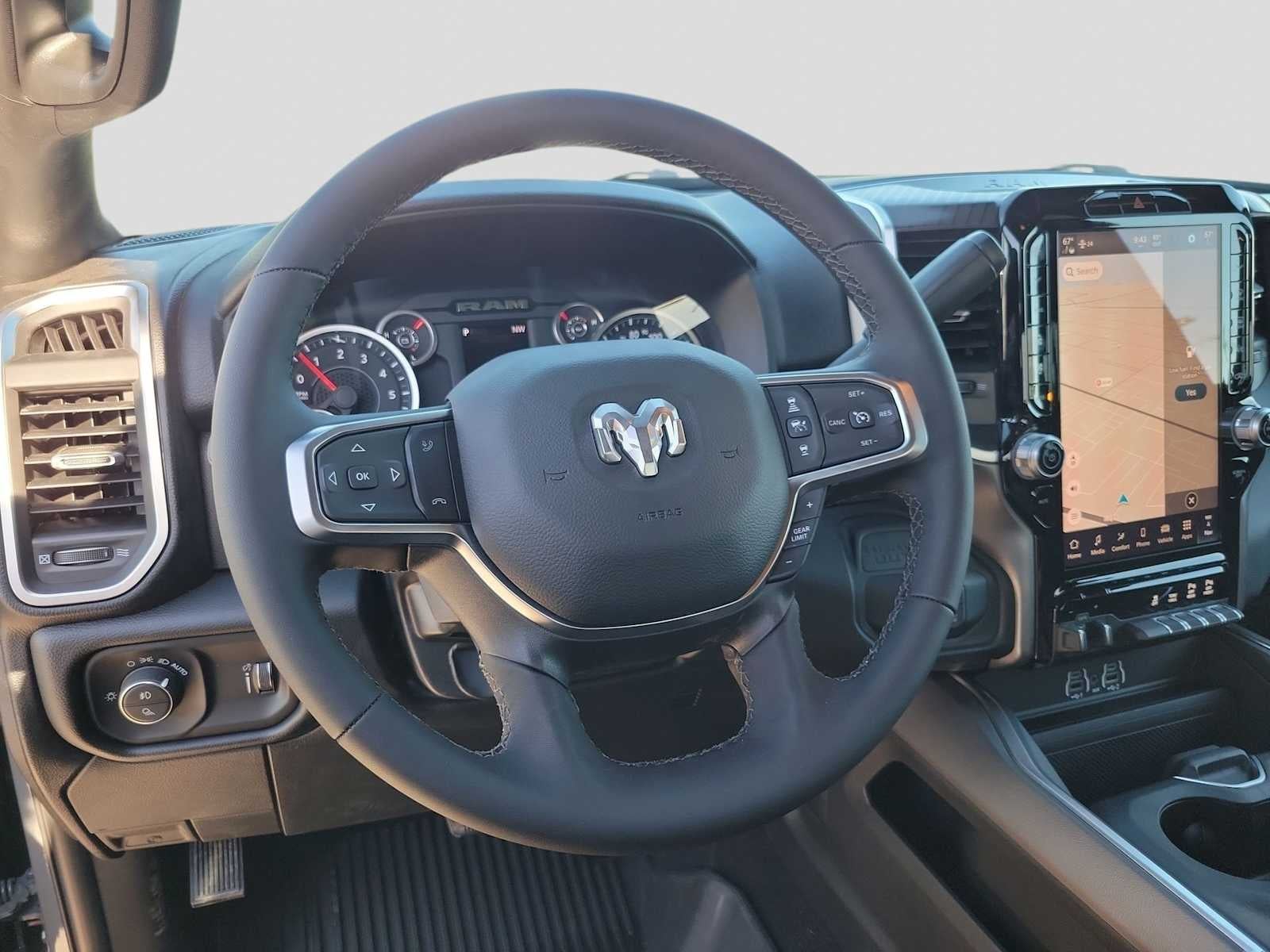 BIG HORN LEVEL 1 PLUS EQUIPMENT GROUP Emergency Vehicle Alert System (EVAS), Lone Star IP Badge, 12 Touchscreen Display, Glove Box Lamp, Auto Power-Folding Mirrors, Footwell Courtesy Lamp, Anti-Spin Differential Rear Axle, MOPAR Deployable Bed Step, Alexa Built-In, Forward & Reverse Utility Lights, Locking Lower Glove Box, Remote Start System, 9 Alpine Speakers w/Subwoofer, Disassociated Touchscreen Display, Dual Glove Boxes, 2nd Row In Floor Storage Bins, Rear View Auto Dim Mirror, Rear Dome w/On/Off Switch Lamp, LED Bed Lighting, GPS Navigation, SiriusXM w/360L, Connected Travel & Traffic Services, Foam Bottle Insert (Door Trim Panel), Off-Road Info Pages, Trailer Tow Pages, HD Radio, Radio: Uconnect 5 Nav w/12.0 Display, Power Heated Folding Telescopic Mirrors, Steering Wheel Mounted, NIGHT EDITION Gloss Black Nostrils/Mic Black Grille, Tires: LT285/60R20E OWL On/Off Road, Black Exterior Truck Badging, Wheels: 20 x 8.0 Black Painted Aluminum, Body Color Grille-Surround, Black Interior Accents, Black Wheel Center Hub, Painted Front Bumper, Painted Rear Bumper, PAINTED FLAT WHEEL-TO-WHEEL SIDE STEPS, HEATED SEATS & WHEEL GROUP Heated Steering Wheel, Heated Front Seats, BLACK, PREMIUM CLOTH BUCKET SEATS Bucket Seats, Power Adjust 8-Way Driver Seat, Folding Flat Load Floor Storage, Rear 60/40 Folding Seat, Front Seat Back Map Pockets, Power 2-Way Driver Lumbar Adjust, Full Length Upgraded Floor Console, TRANSMISSION: 8-SPEED AUTO (8HP75-LCV) (STD), ENGINE: 6.4L V8 HEMI HD (STD). Ram Lone Star with Ceramic Gray Clearcoat exterior and Black interior features a 8 Cylinder Engine with 405 HP at 5600 RPM*.