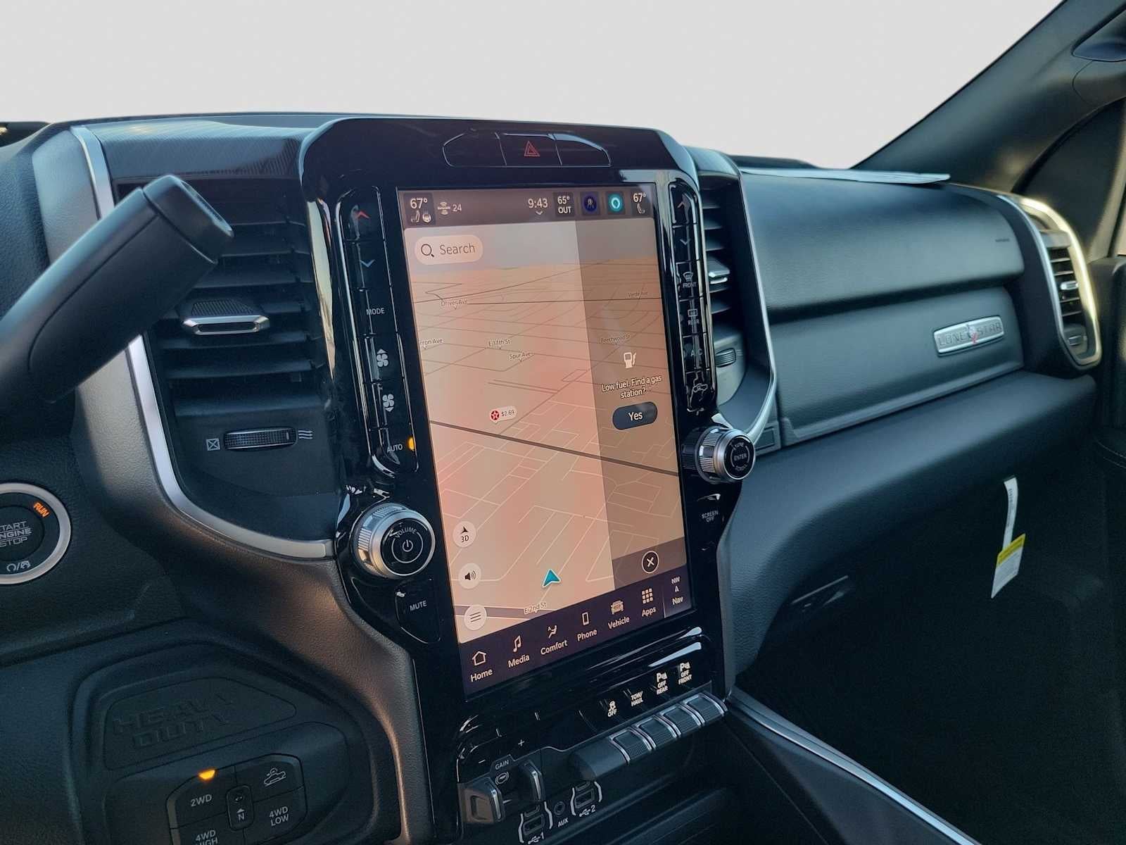 BIG HORN LEVEL 1 PLUS EQUIPMENT GROUP Emergency Vehicle Alert System (EVAS), Lone Star IP Badge, 12 Touchscreen Display, Glove Box Lamp, Auto Power-Folding Mirrors, Footwell Courtesy Lamp, Anti-Spin Differential Rear Axle, MOPAR Deployable Bed Step, Alexa Built-In, Forward & Reverse Utility Lights, Locking Lower Glove Box, Remote Start System, 9 Alpine Speakers w/Subwoofer, Disassociated Touchscreen Display, Dual Glove Boxes, 2nd Row In Floor Storage Bins, Rear View Auto Dim Mirror, Rear Dome w/On/Off Switch Lamp, LED Bed Lighting, GPS Navigation, SiriusXM w/360L, Connected Travel & Traffic Services, Foam Bottle Insert (Door Trim Panel), Off-Road Info Pages, Trailer Tow Pages, HD Radio, Radio: Uconnect 5 Nav w/12.0 Display, Power Heated Folding Telescopic Mirrors, Steering Wheel Mounted, NIGHT EDITION Gloss Black Nostrils/Mic Black Grille, Tires: LT285/60R20E OWL On/Off Road, Black Exterior Truck Badging, Wheels: 20 x 8.0 Black Painted Aluminum, Body Color Grille-Surround, Black Interior Accents, Black Wheel Center Hub, Painted Front Bumper, Painted Rear Bumper, PAINTED FLAT WHEEL-TO-WHEEL SIDE STEPS, HEATED SEATS & WHEEL GROUP Heated Steering Wheel, Heated Front Seats, BLACK, PREMIUM CLOTH BUCKET SEATS Bucket Seats, Power Adjust 8-Way Driver Seat, Folding Flat Load Floor Storage, Rear 60/40 Folding Seat, Front Seat Back Map Pockets, Power 2-Way Driver Lumbar Adjust, Full Length Upgraded Floor Console, TRANSMISSION: 8-SPEED AUTO (8HP75-LCV) (STD), ENGINE: 6.4L V8 HEMI HD (STD). Ram Lone Star with Ceramic Gray Clearcoat exterior and Black interior features a 8 Cylinder Engine with 405 HP at 5600 RPM*.