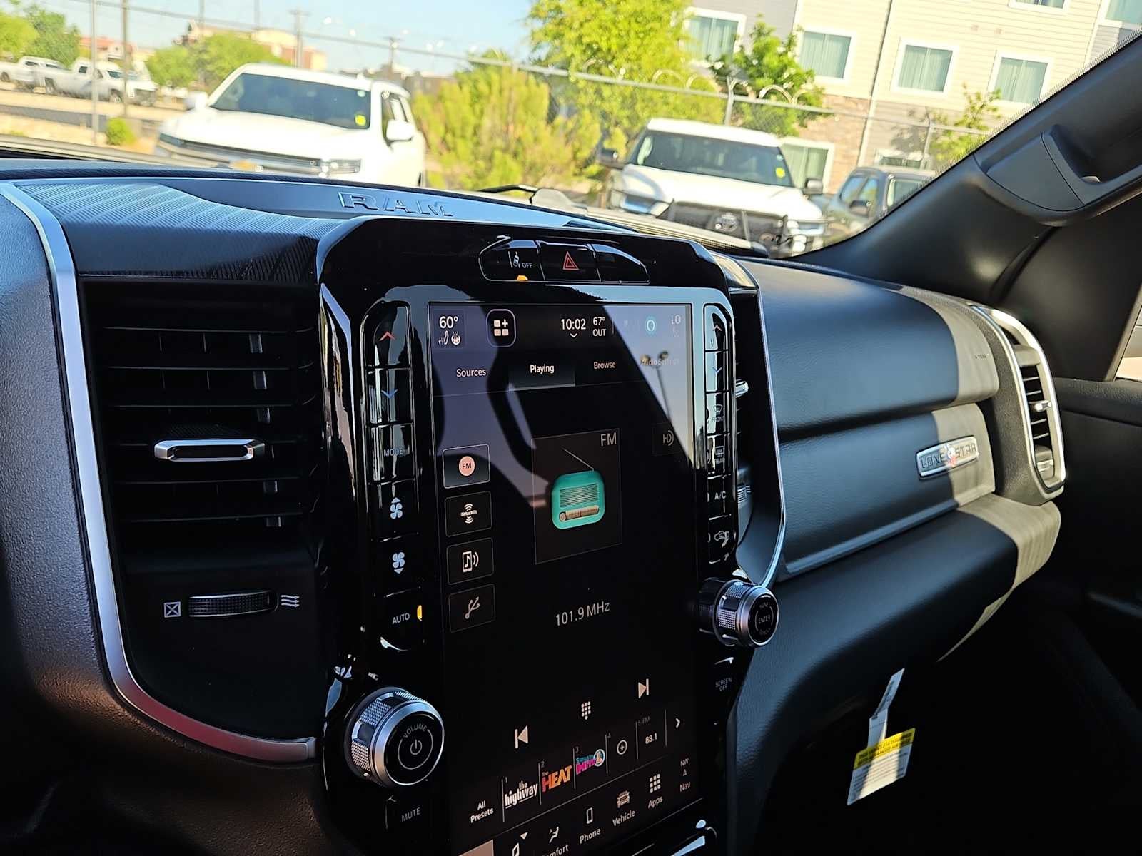 BIG HORN LEVEL 2 EQUIPMENT GROUP SiriusXM Radio Service, Power Adjustable Pedals, Leather Wrapped Steering Wheel, 12 Touchscreen Display, Glove Box Lamp, Auto Power-Folding Mirrors, 115V Auxiliary Rear Power Outlet, Media Hub w/2 Charge Only USBs, Heated Front Seats, Security Alarm, Black Premium Power Mirrors, Premium Overhead Console, 9 Amplified Speakers w/Subwoofer, Disassociated Touchscreen Display, Body Color Fender Flares, Remote Tailgate Release, 115V Auxiliary Power Outlet, LED Dome Lamp w/On/Off Switch, Universal Garage Door Opener, 2nd Row In Floor Storage Bins, Sun Visors w/Illuminated Vanity Mirrors, LED Footwell Lighting, Rear Window Defroster, Rear View Auto Dim Mirror, Rear Power Sliding Window, GPS Navigation, Overhead LED Lamps, Wheels: 20 x 9 Aluminum Chrome Clad, NIGHT EDITION Tires: 275/55R20 OWL All Season, Bridgestone Brand Tires, Accent Color Premium Power Mirrors, Exterior Mirrors w/Supplemental Signals, Black Headlamp Bezels, Exterior Mirrors Courtesy Lamps, Grille Black Surround Black Mesh, Auto Power-Folding Mirrors, Wheels: 20 x 9.0 Aluminum Painted Clad, Auto Dim Exterior Driver Mirror, Black Exterior Truck Badging, Anti-Spin Differential Rear Axle, Accent Color Door Handles, Accent Color Tailgate Handle, Black Interior Accents, Dual Exhaust w/Black Tips, Body Color Front Bumper, Body Color Rear Bumper w/Step Pads, Black Tail Lamp Bezels, RAM Grille Badge - Black, Black Painted Exterior Mirrors Caps, Rear Wheelhouse Liners, MOPAR FRONT & REAR RUBBER FLOOR MATS, TRANSMISSION: 8-SPEED AUTOMATIC (850RE) (STD), ENGINE: 3.6L V6 24V VVT ETORQUE UPG I (STD). Ram Lone Star with Bright White Clearcoat exterior and Black interior features a V6 Cylinder Engine with 305 HP at 6400 RPM*.