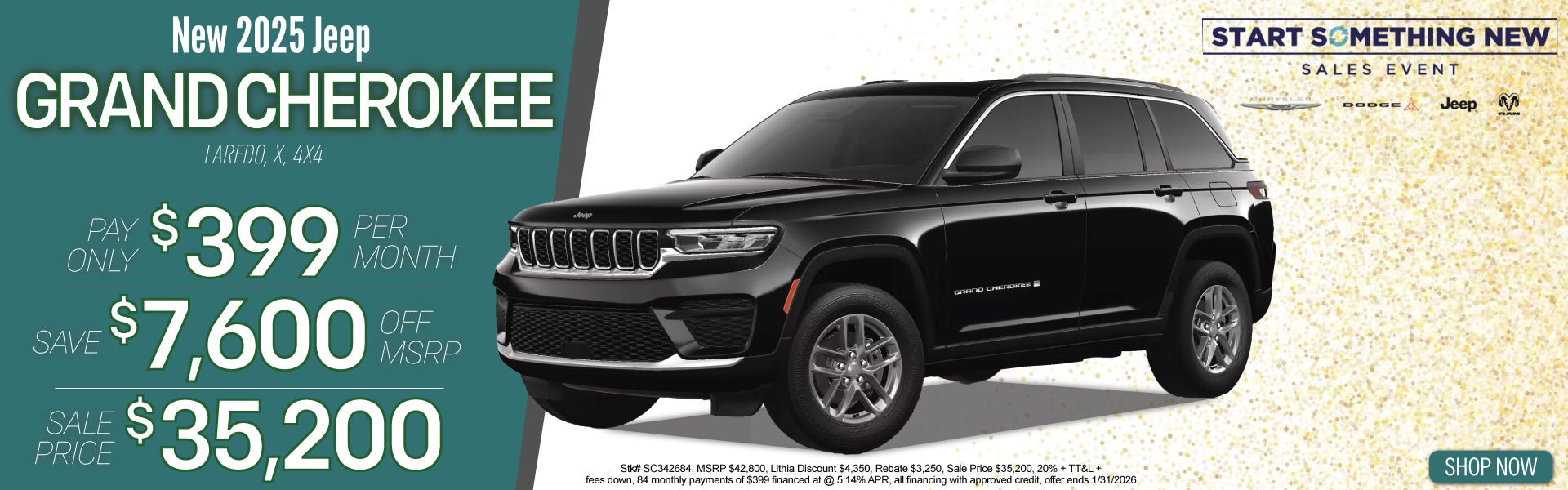 1 at this price, Stk# SC342684, MSRP $42,800, Lithia Discount $4,350, Rebate $3,250, Sale Price $35,200, 20% + TT&L + Fees down, 84 monthly payments of $399 @ 5.14% APR, all financing with approved credit, ends 1/31/26.