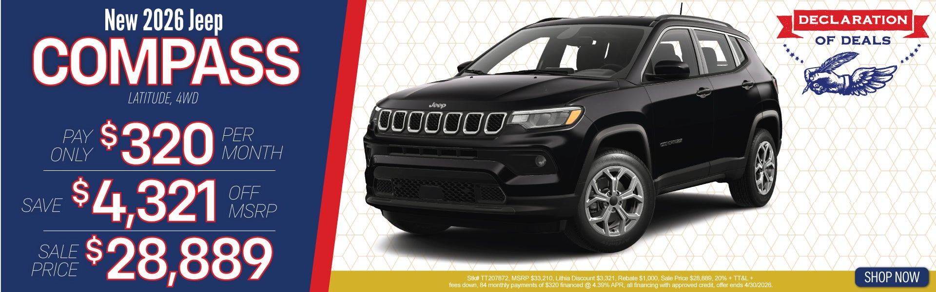 Stk# TT207872, MSRP $33,210, Lithia Discount $3,321, Rebate $1,000, Sale Price $28,889, 20% + TT&L + fees down, 84 monthly payments of $320 financed at @ 4.39% APR, all financing with approved credit, offer ends 4/30/26.